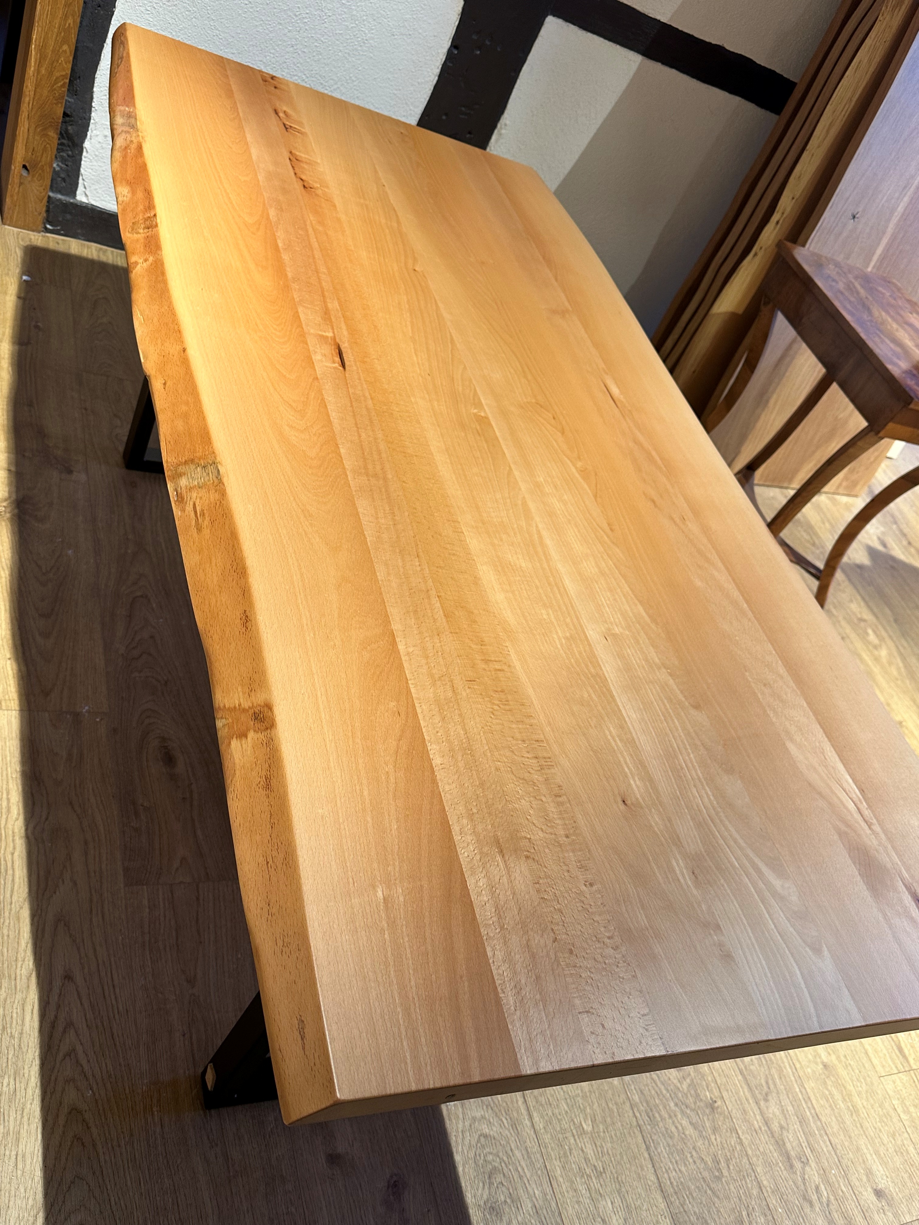 Esche ist heimisches helles Hartholz, gern für Furniere wegen der schönen Maserung und im Möbelbau genommen. Durch den unterschiedlich vorkommenden Kern kommt noch mehr "Leben" zum Ausdruck. Dieser Tisch hat außergewöhnlich schöne natürliche Baumkanten, was ihn zu einem besonderen natürlichen Unikat macht.