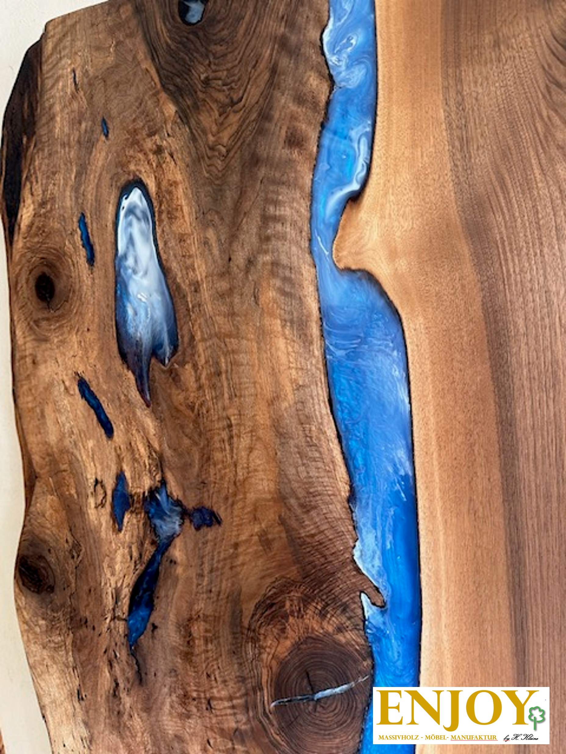 Die Kanten der Tischplatte bestehen aus edlem Nussbaumholz mit natürlicher Baumkante. Dieser Kontrast zwischen dem dunklen Holz und dem strahlenden blauen Epoxid verleiht der Tischplatte einen modernen und zugleich rustikalen Charakter.