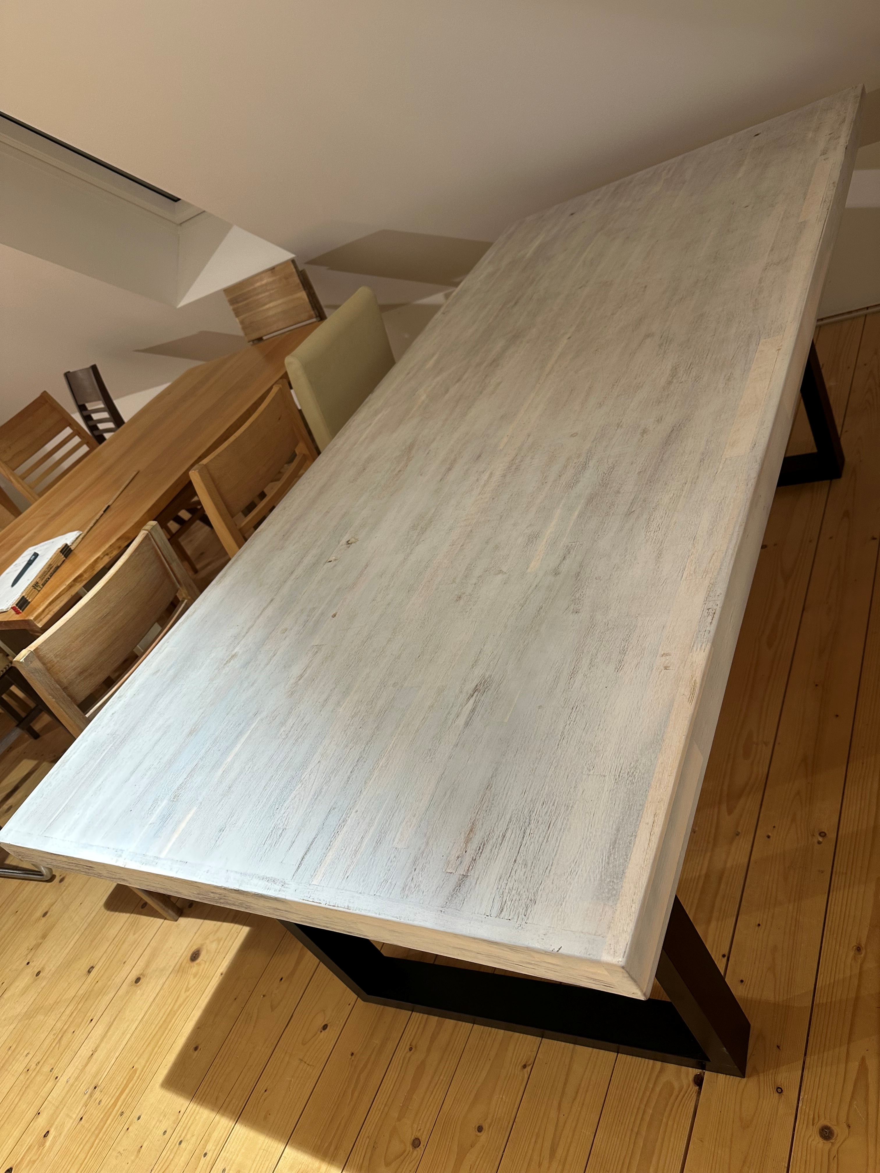 Dieser Tisch ist ein Ausstellungsstück. Das Material ist Akazie das gekalkt wurde und so den charakteristische weißen Ton bekommen hat. Enthalten sind Metallfüße, schwarz in U-Form.